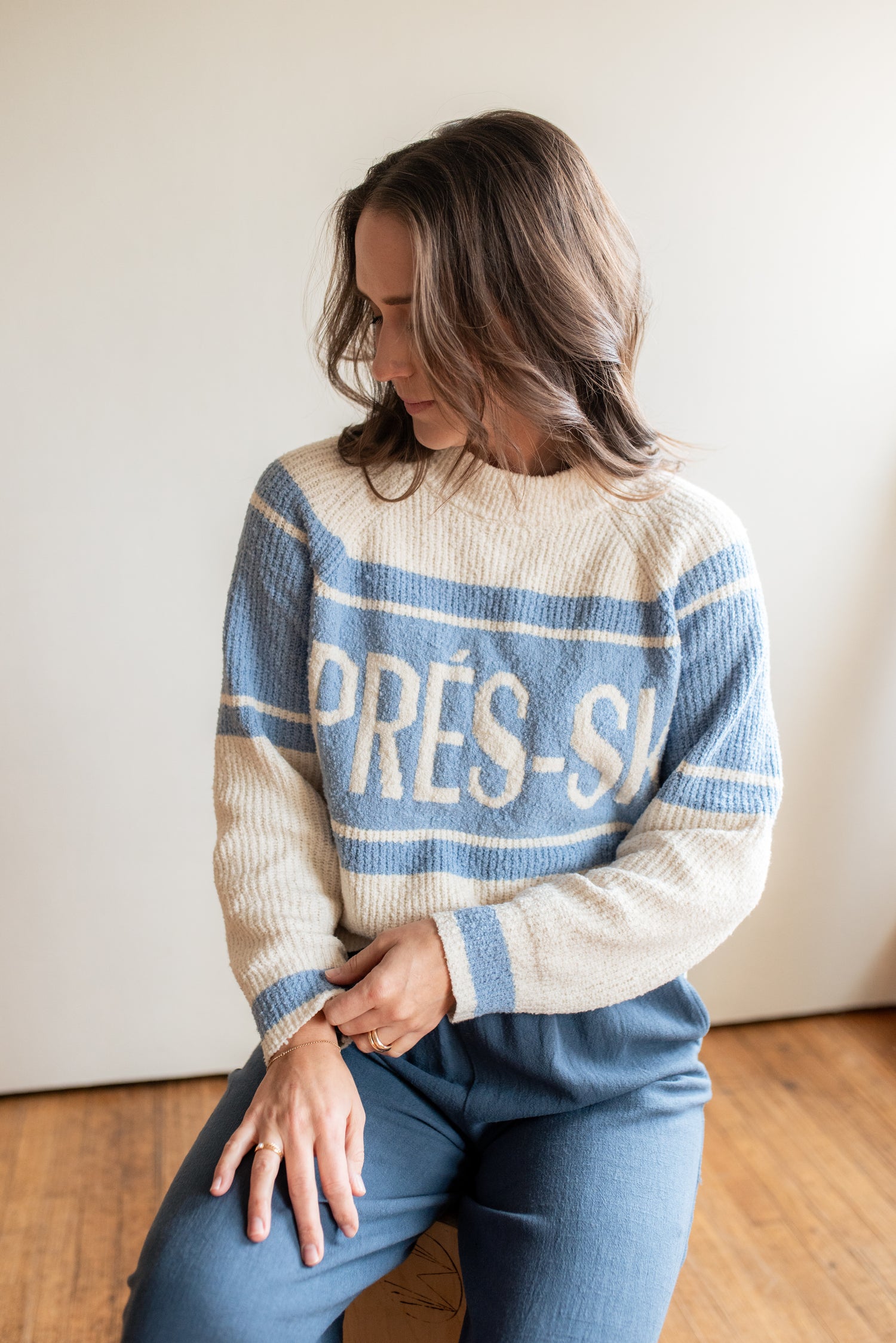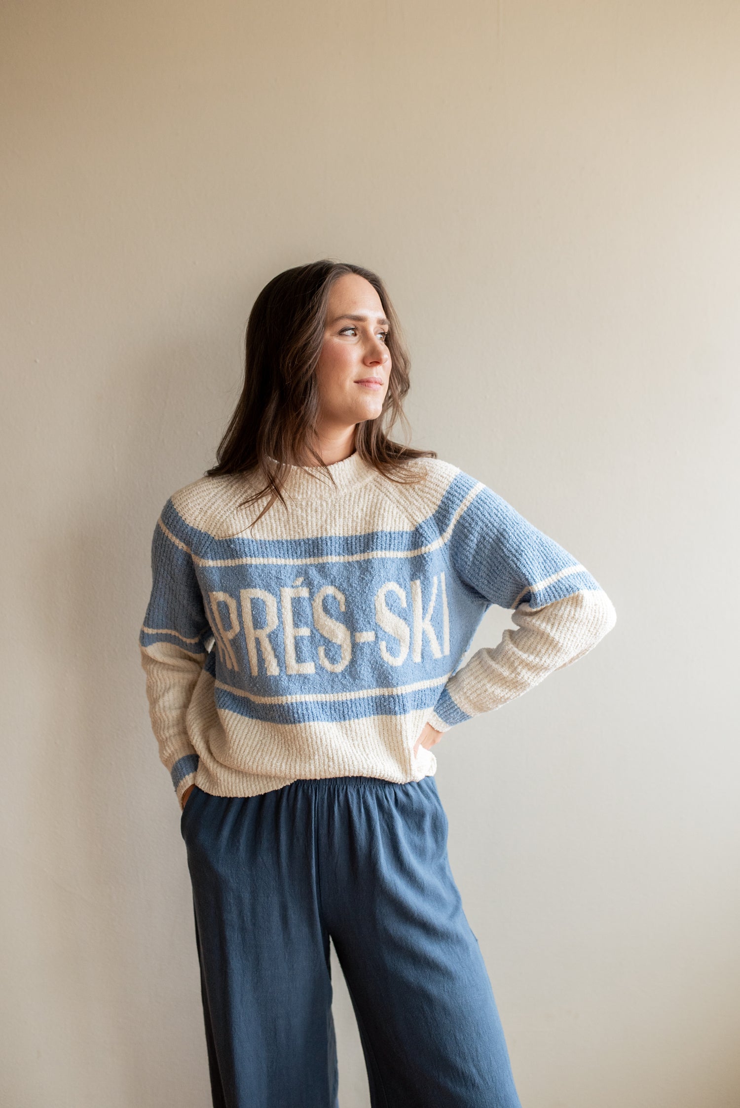 Crew neck, knit sweater with Aprés Ski graphic.