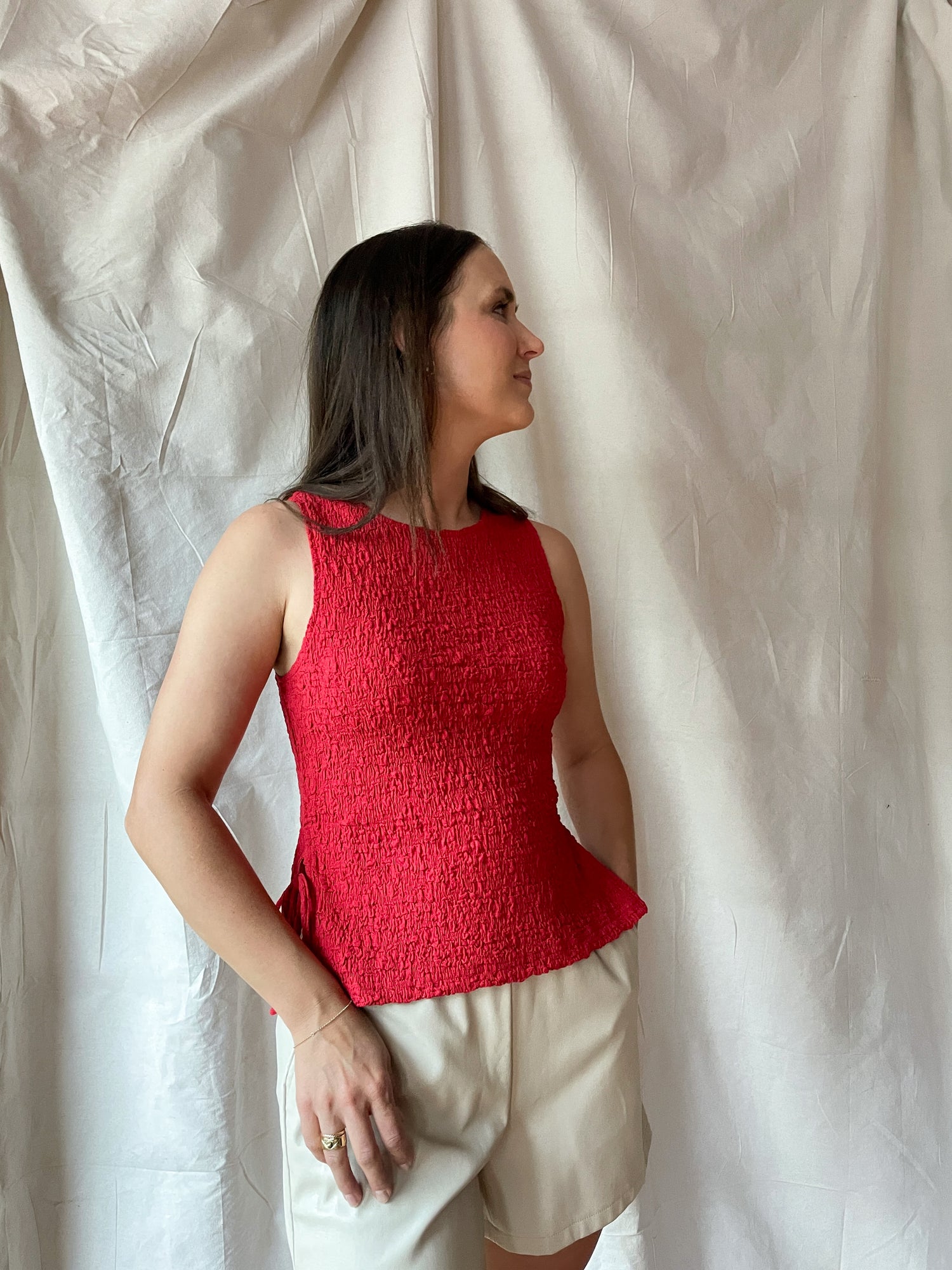 The bright color & light fabric makes it a great pairing for neutral faux leather shorts or with your favorite denim.