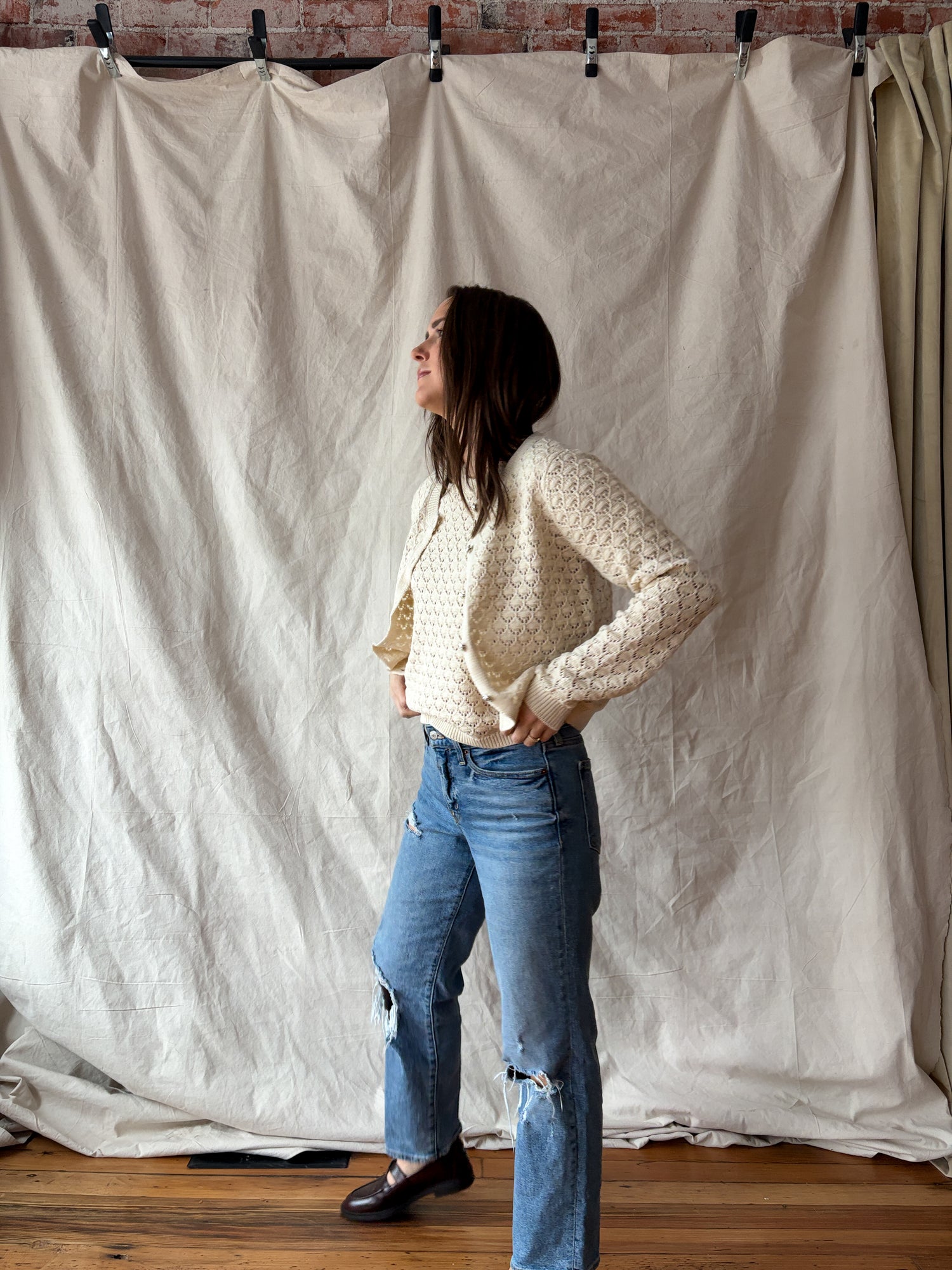 Beautiful eyelet knit cardigan with scalloped pattern.