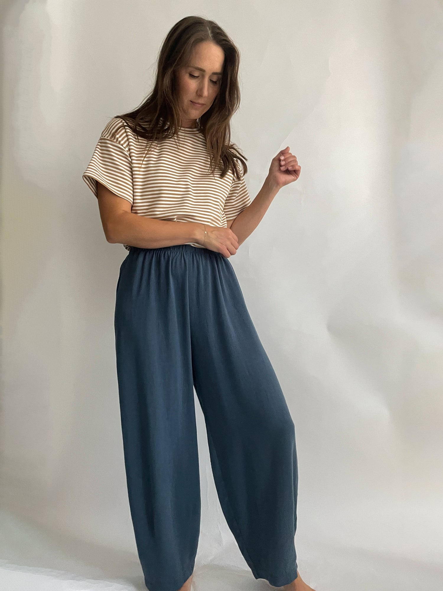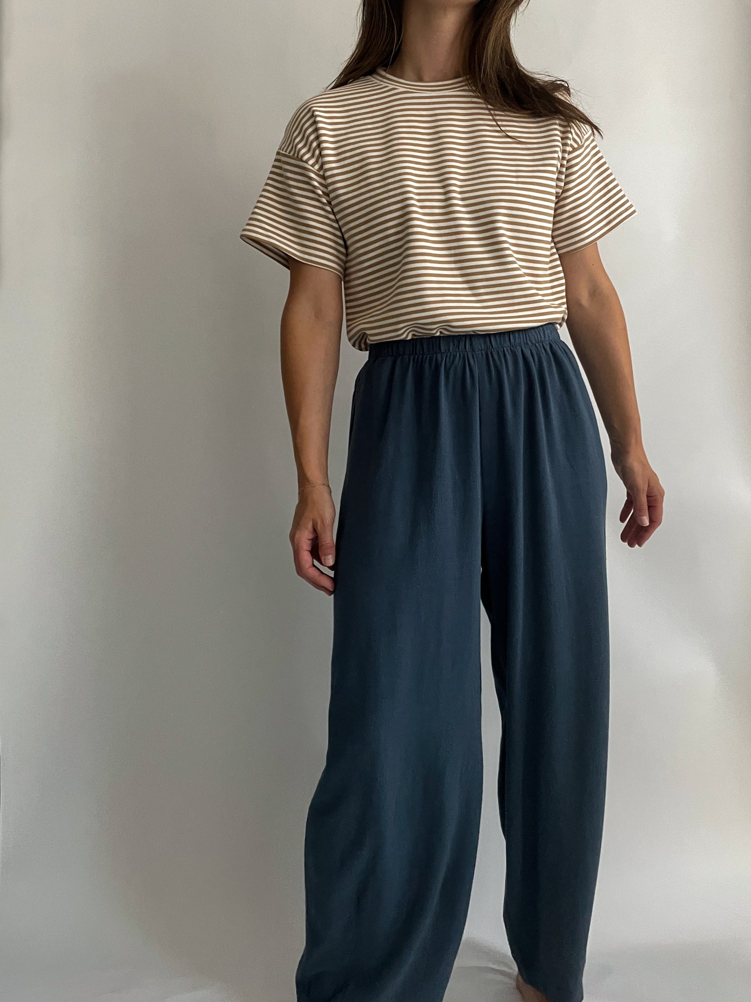 Paired here with our favorite Flytte Tee. Looks great with any favorite tee and fitted crop tops. An easy, comfortable pant for every day wear. Can be worn casually with sandals & tees or dressed up with kitten heels and dressier tops. Even office-friendly with our Ari Top.