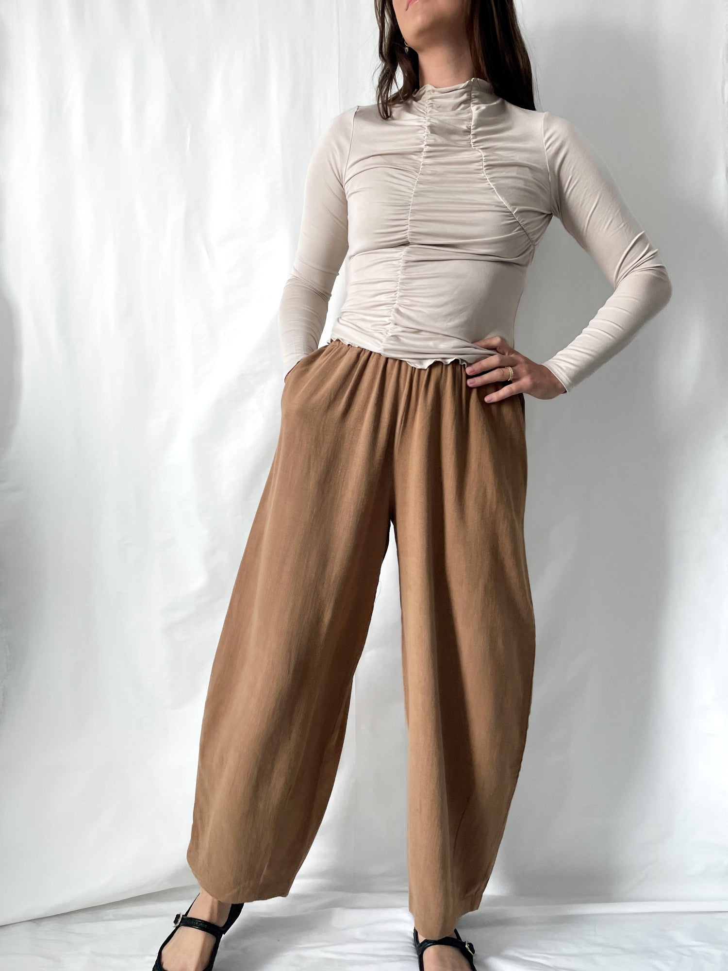 Paired here with the new Nocha Top. Looks great with any favorite tee, sweatshirts or fitted crop tops. An easy, comfortable pant for every day wear. Can be worn casually with sandals & tees or dressed up with ballet flats and button ups.