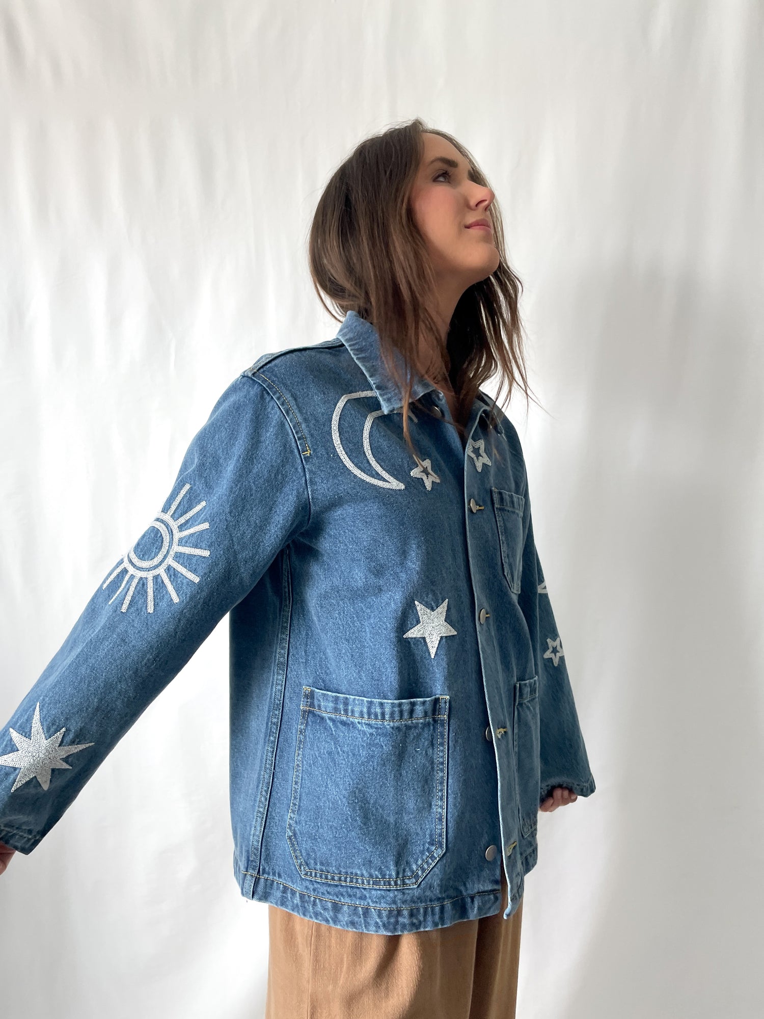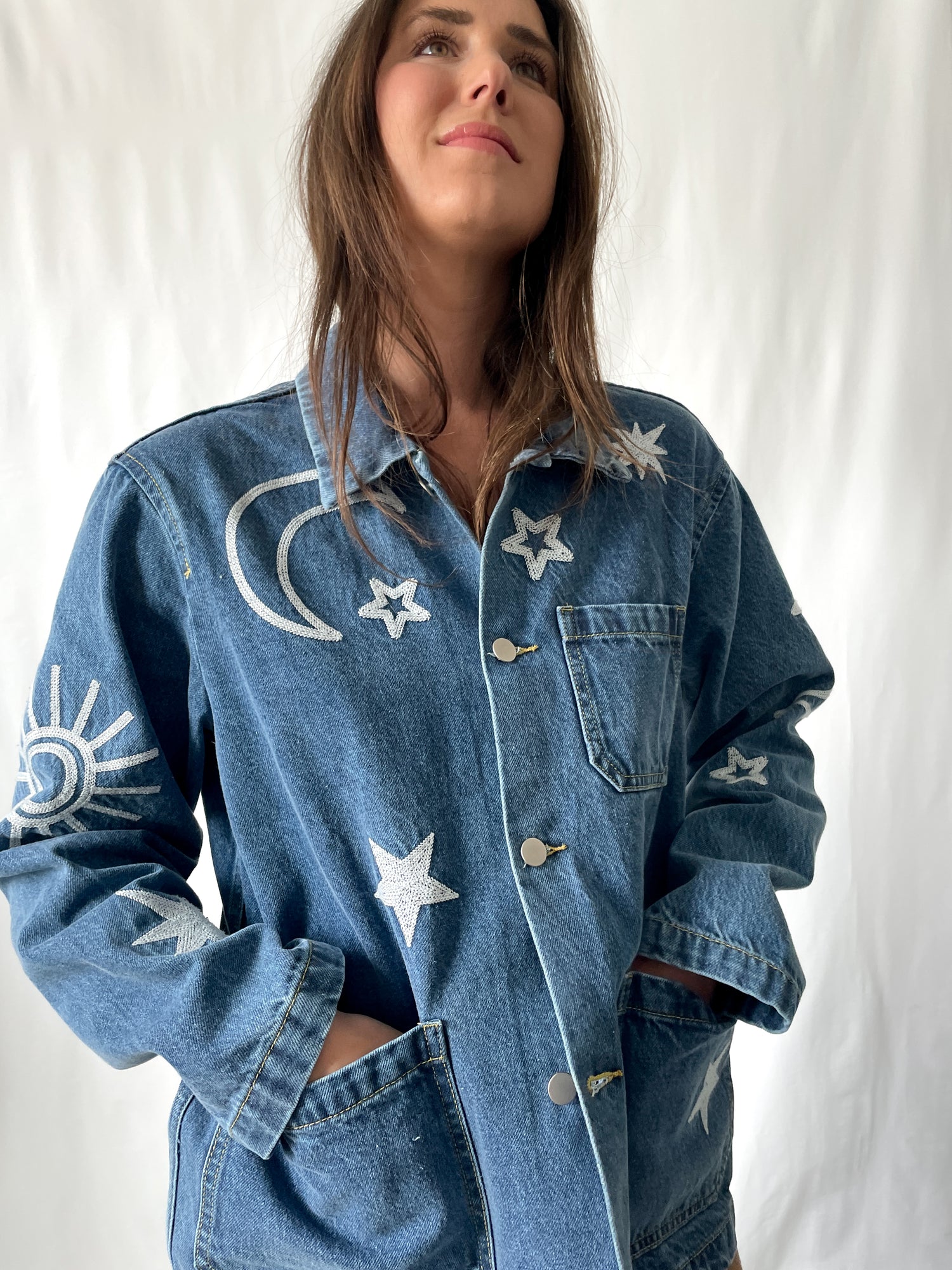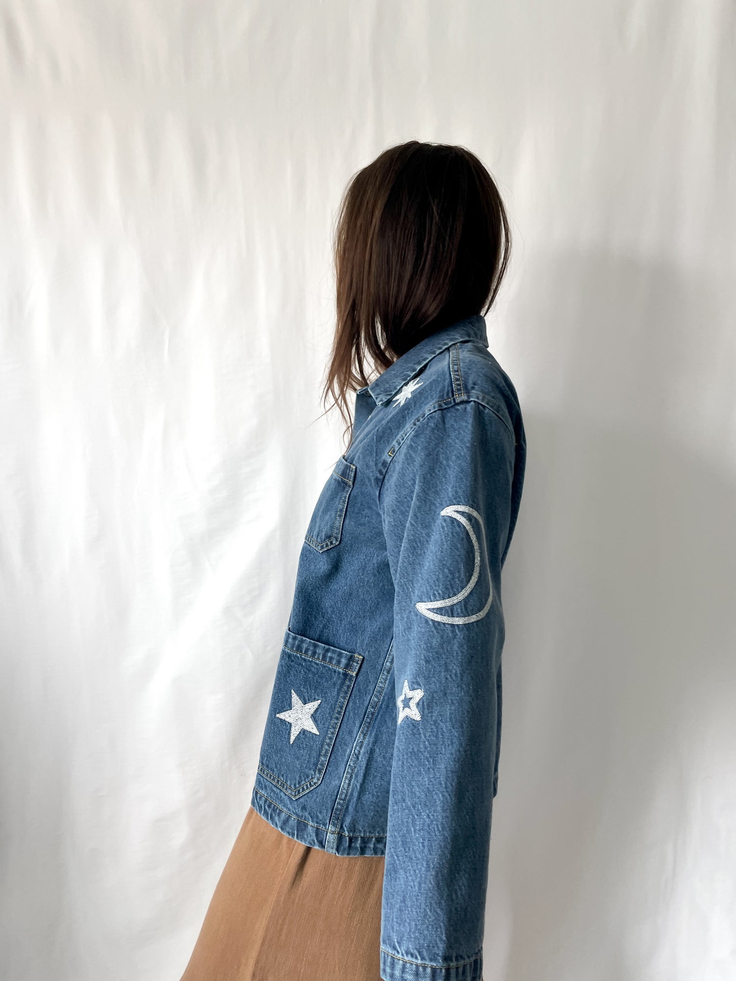 An update to your denim jacket collection, this one brings edge & fun to any outfit. Worn here as a top with our Drom Pant. Can be closed and worn as a denim top or open with layers underneath - over dresses & tops, with skirts, pants & shorts.