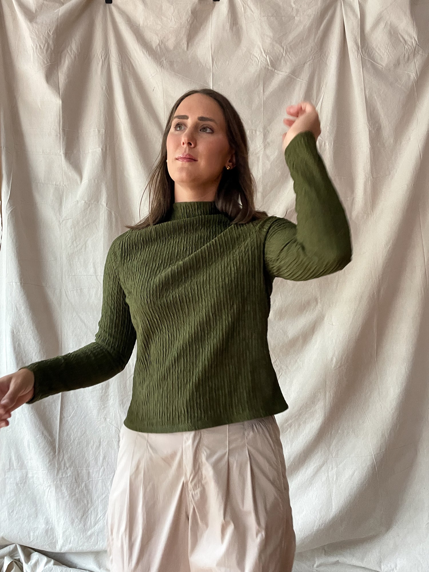 A basic with flair, this will go with anything in your closet. It looks very chic tucked into a denim skirt or high waist jeans. Also a great layer for under blazers & sweaters.