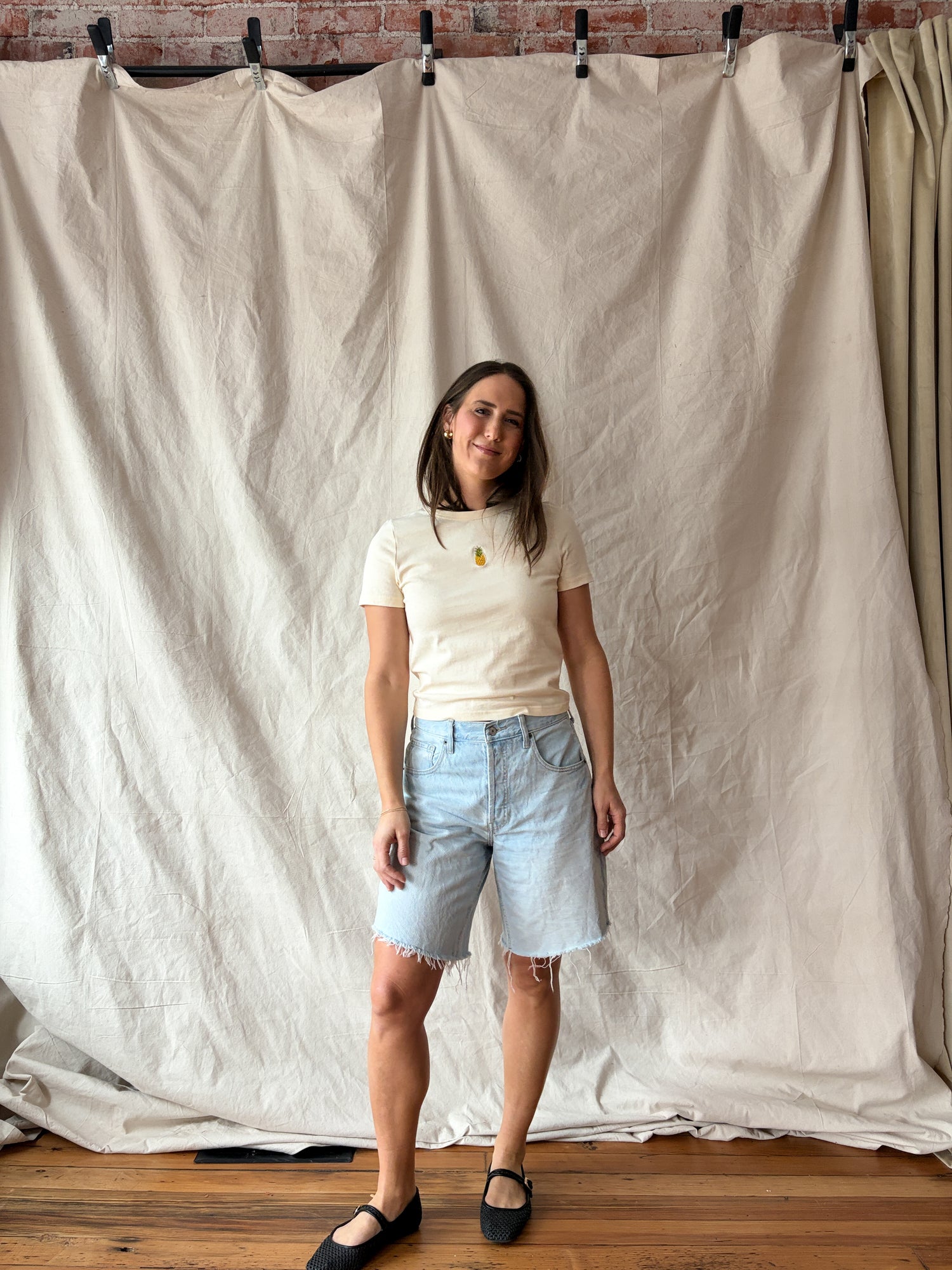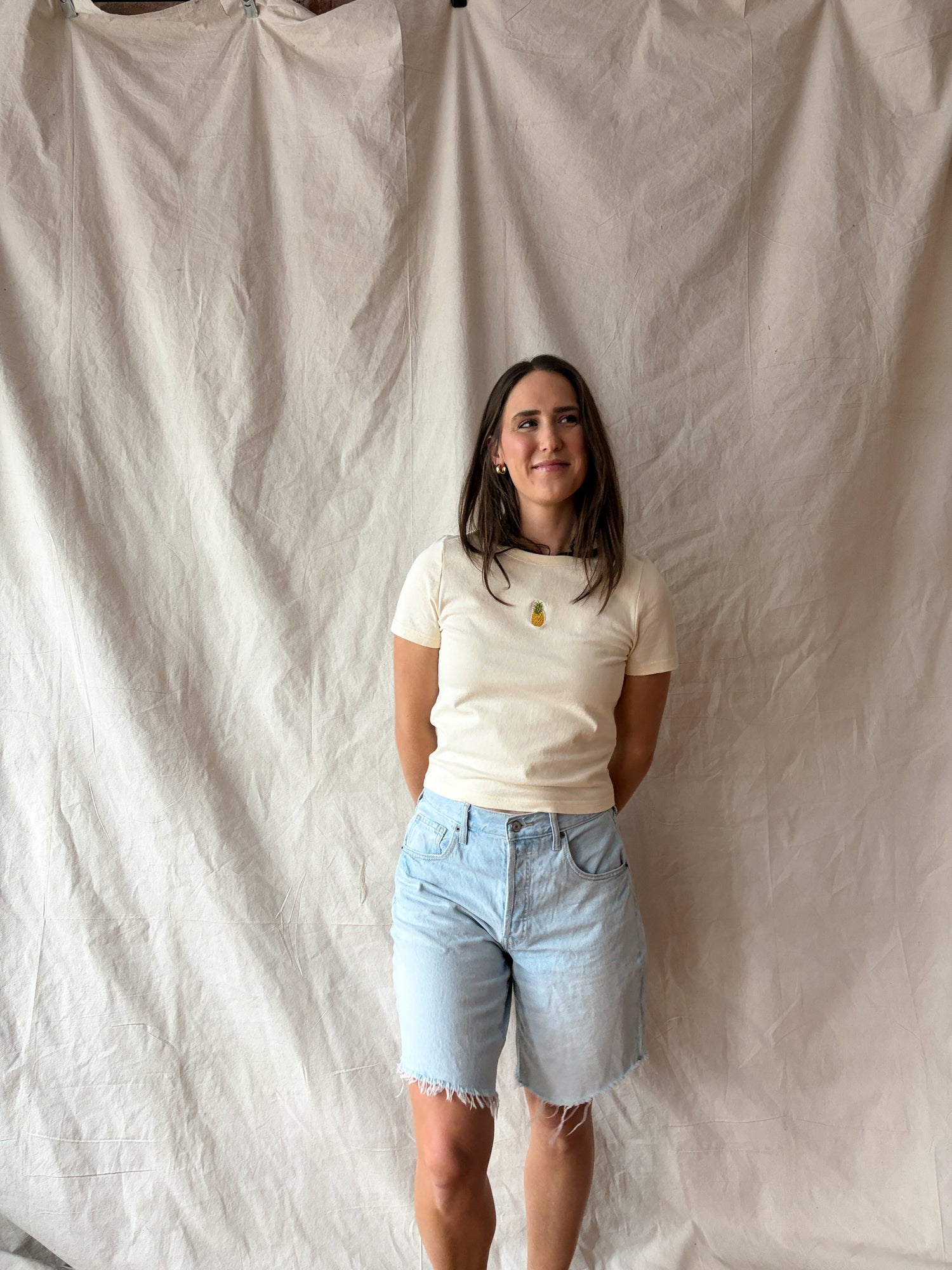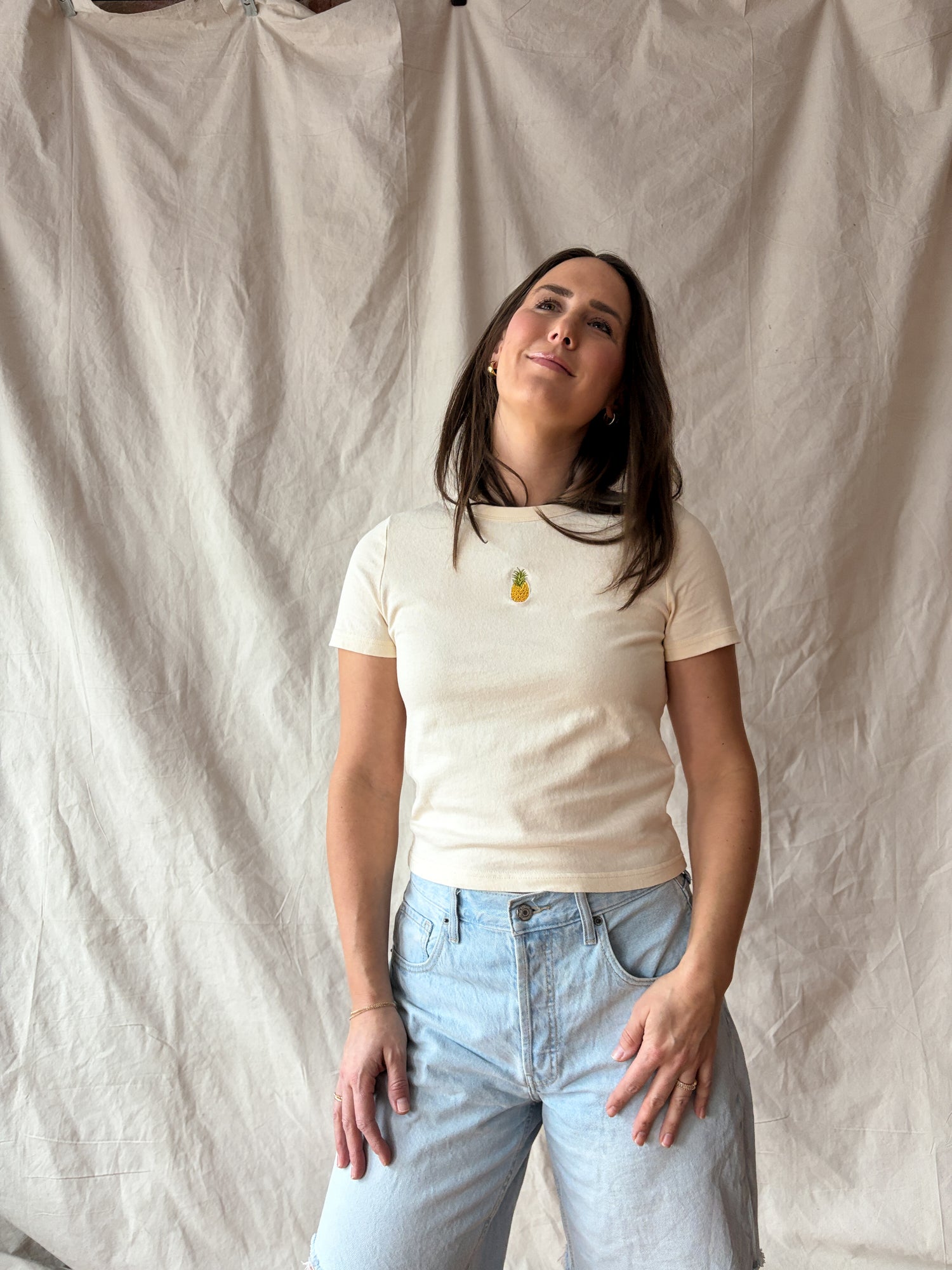 Mini pineapple embroidered detail at chest.