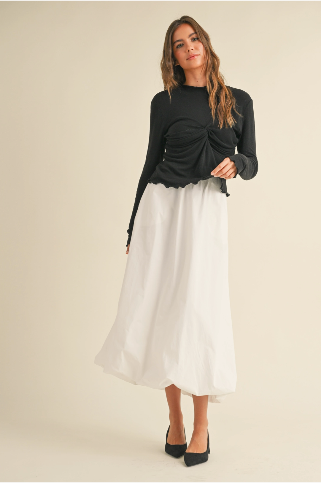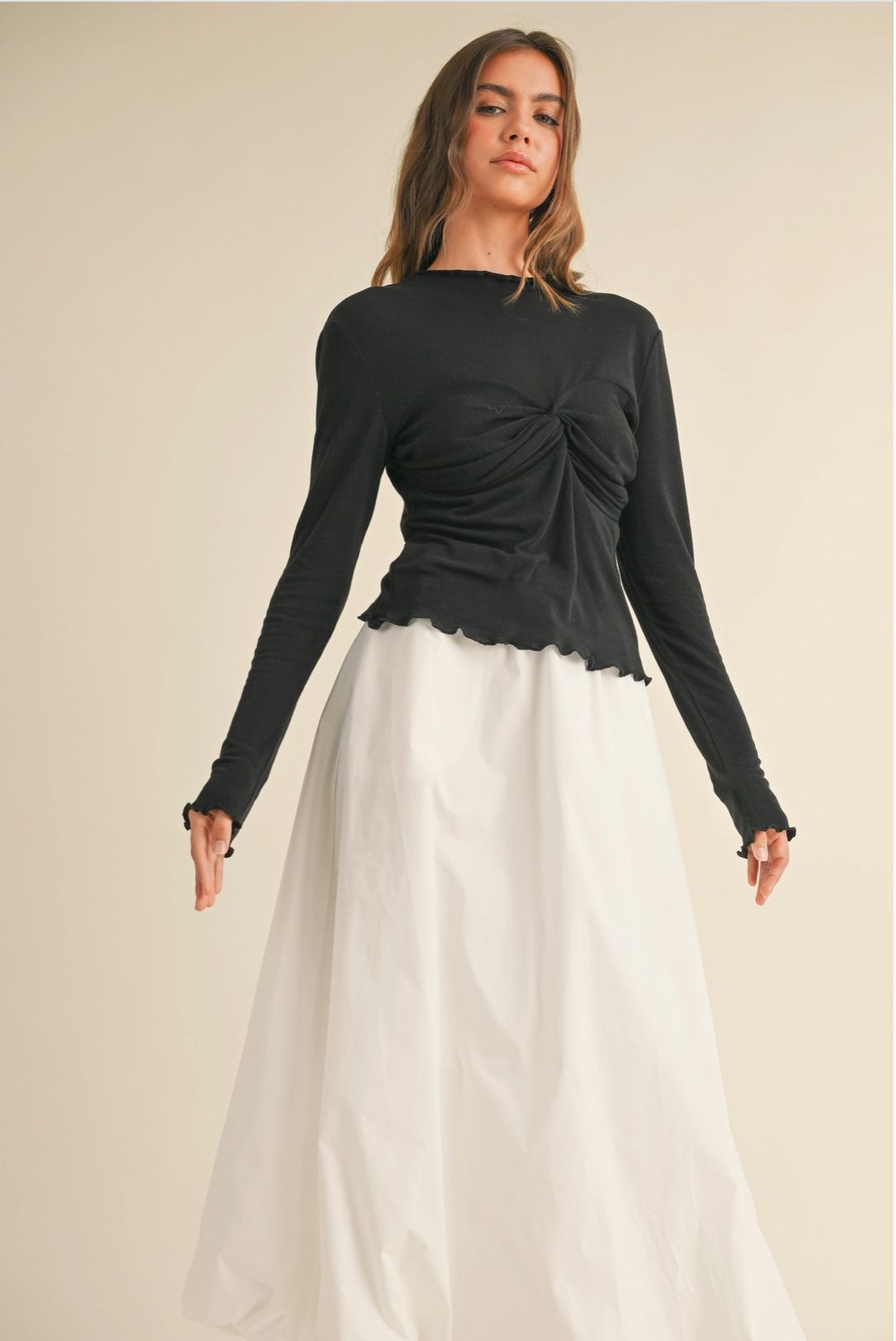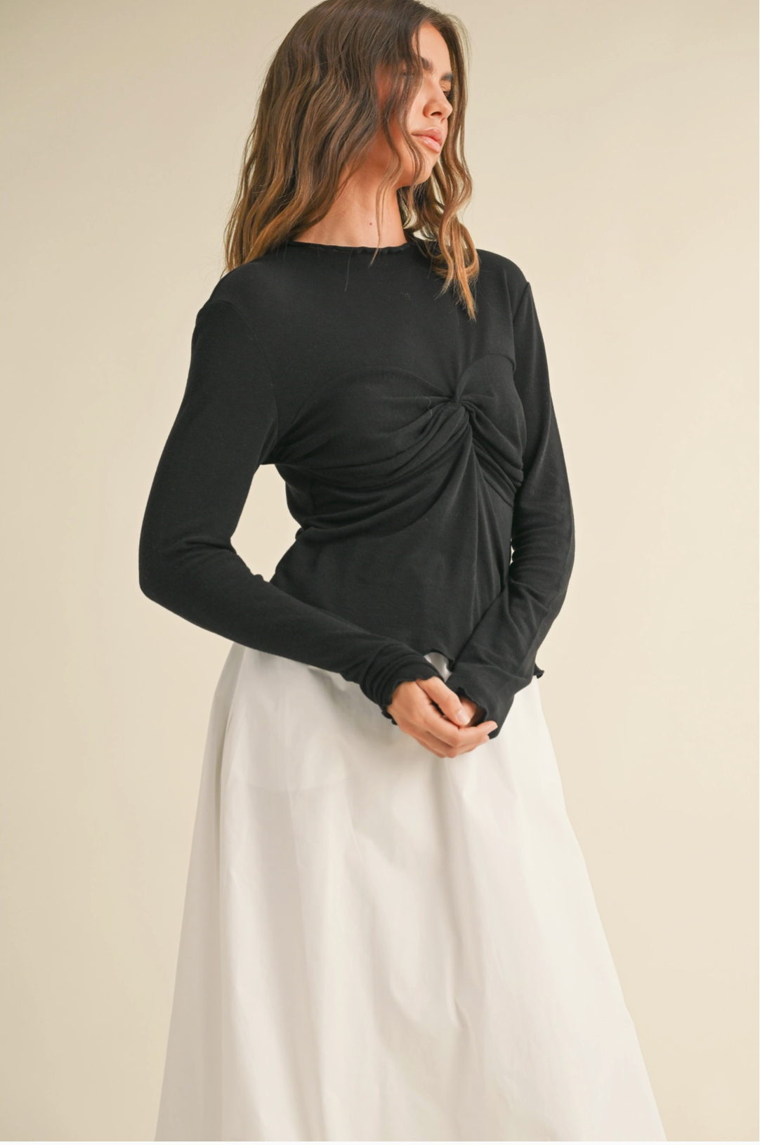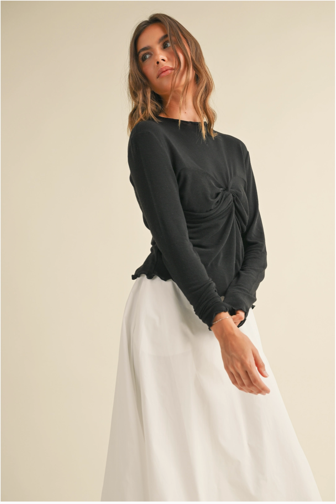 An easy, comfortable top to add a little femininity to a skirt, jeans, or trousers outfit. Looks excellent alone, but also makes a statement as a layer under blazers or jackets. Dress it up or down, for the office or for fun.